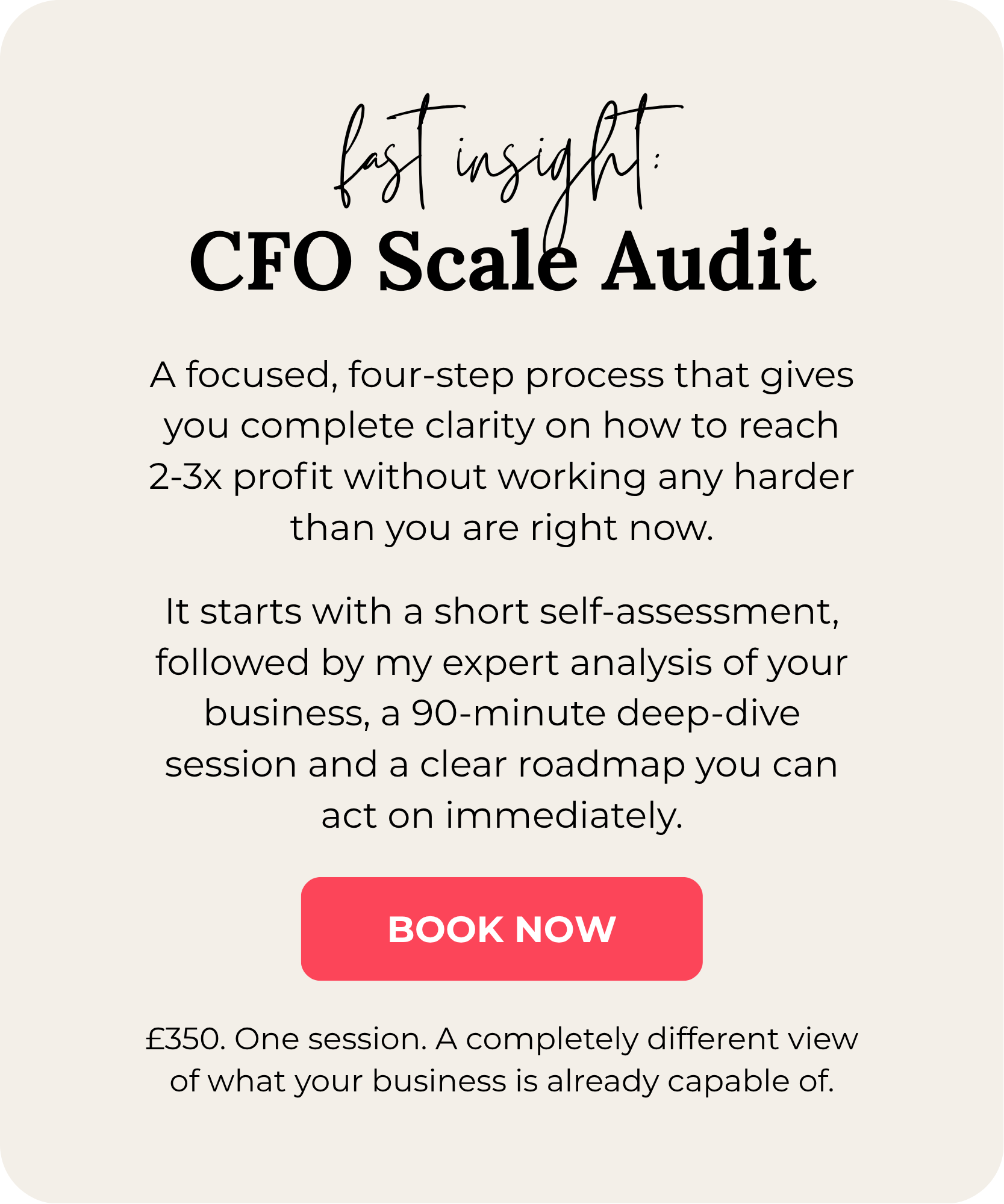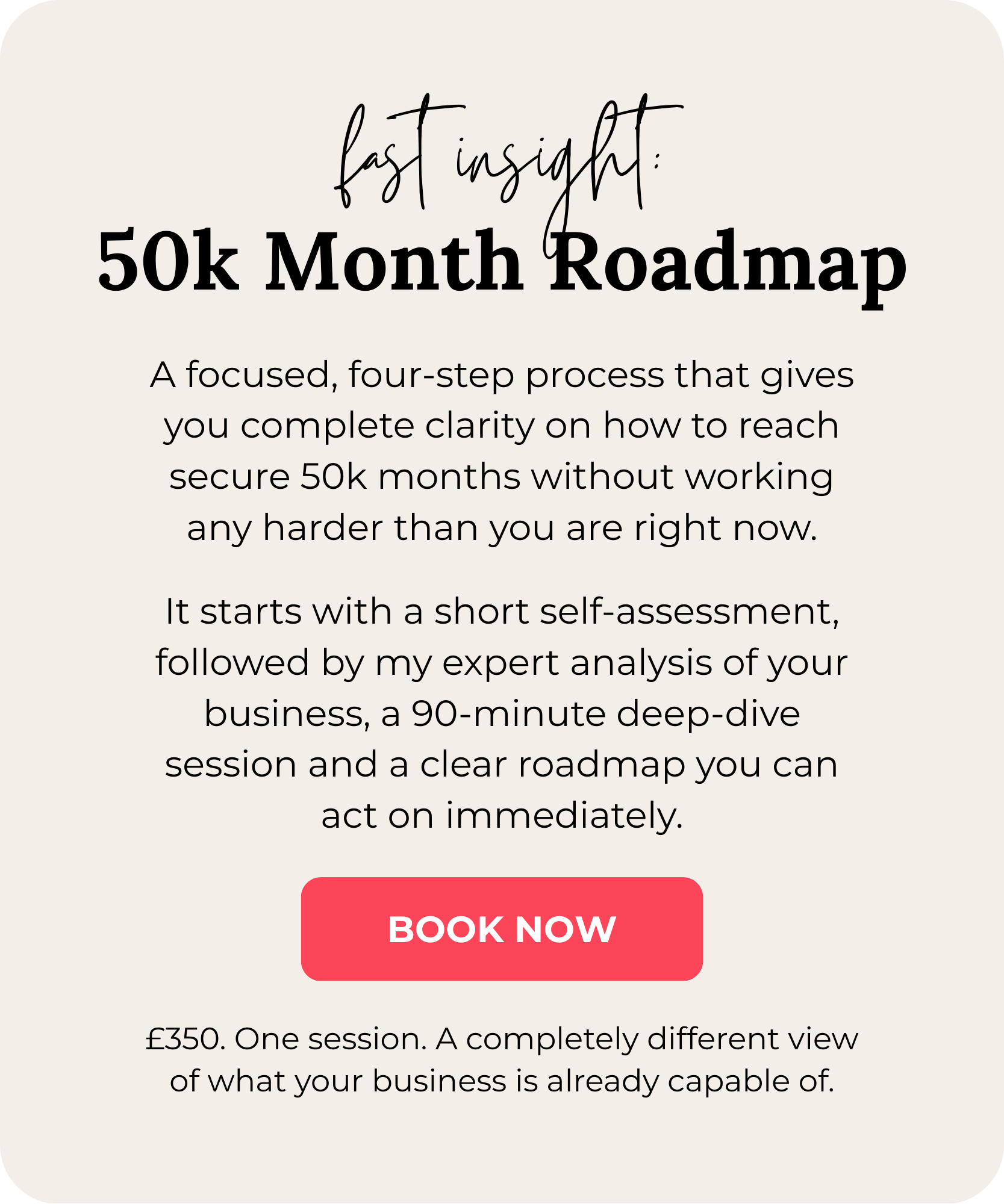 The 50K Month Roadmap is a 90-minute diagnostic session where I look under the bonnet of your business and show you exactly where the profit and capacity you need are already sitting. You'll walk away with a clear, practical roadmap for getting to 50k+ months without working harder or chasing more clients.